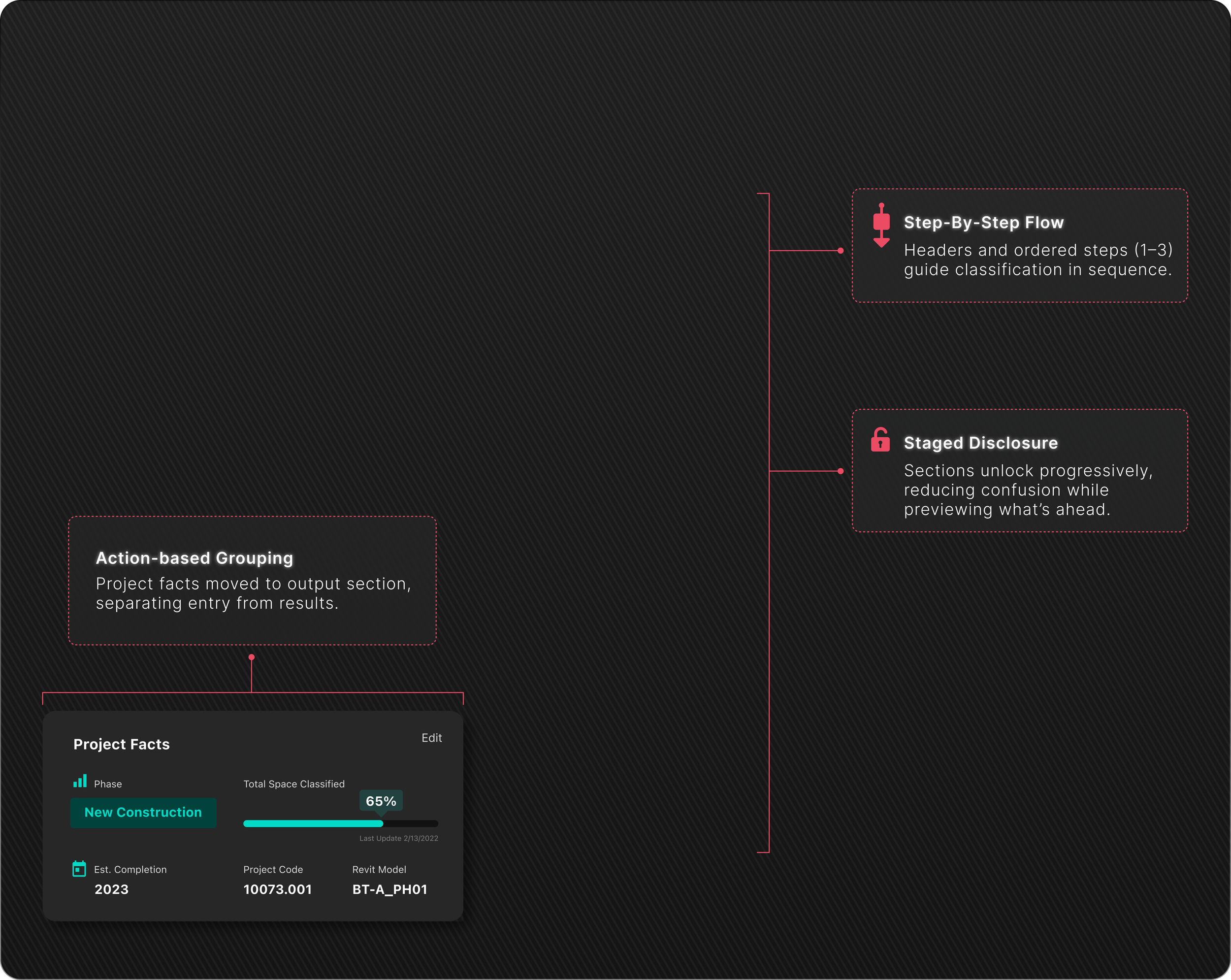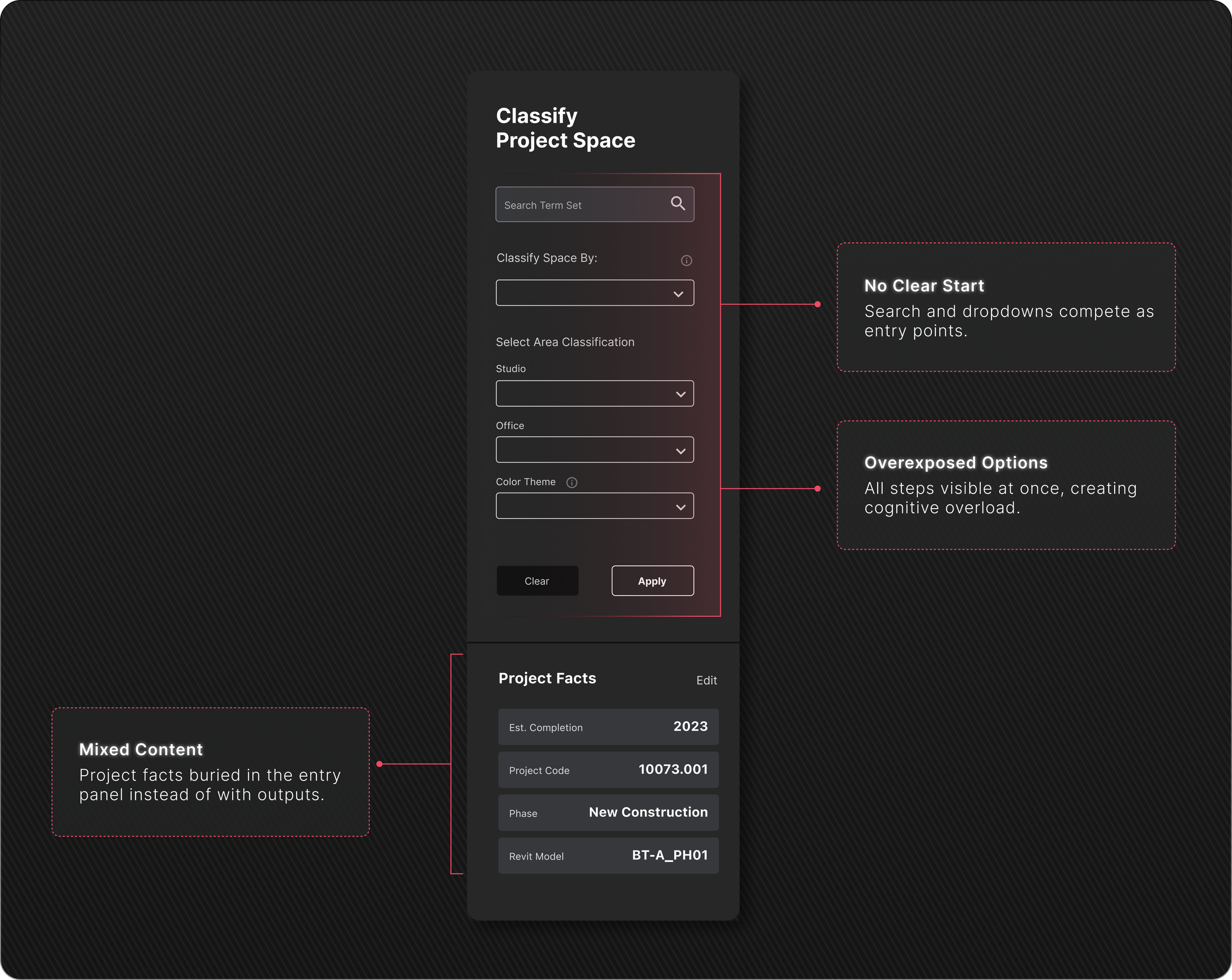 Led end-to-end UX/UI design and collaborated with a team of five to deliver a Revit data analysis plugin that streamlined spatial classification, centralized data management, and improved workflow efficiency, adopted by 400+ users across six studios.