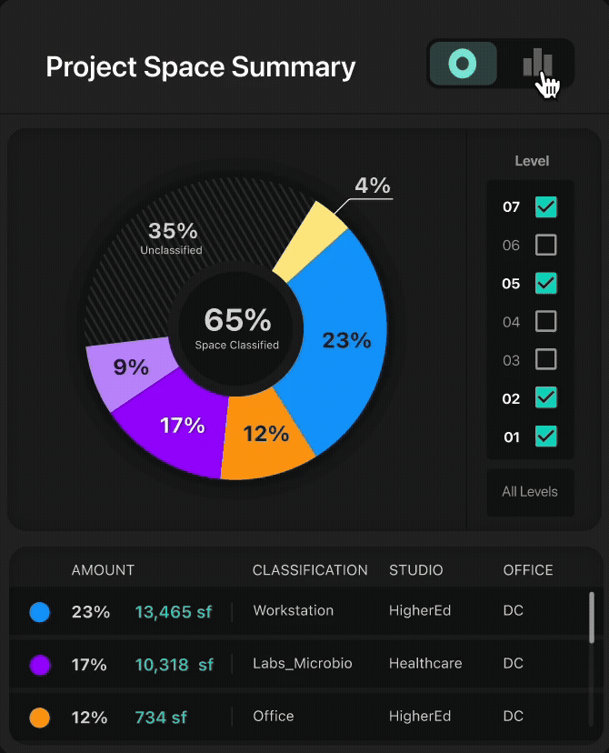 Toggle between a circle graph for building totals and bars for easy space-type comparisons.